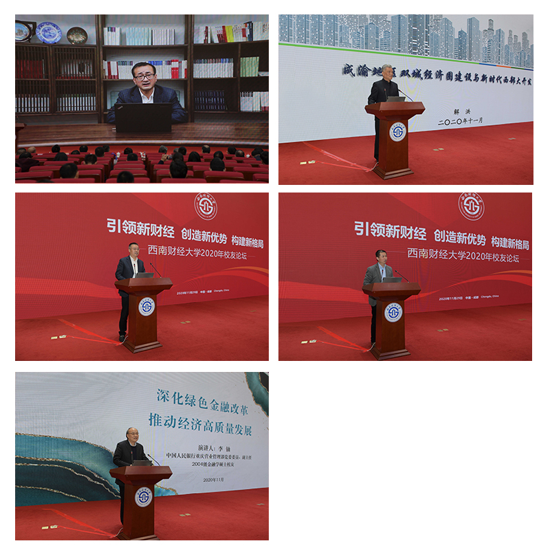 校友论坛中,中国人民大学副校长刘元春,四川省政协原副主席解洪,成都市地方金融监管局党组书记、局长梁其洲,中国人民银行成都分行党委委员、副行长方昕,中国人民银行重庆营业管理部党委委员、副主任李铀分别围绕“‘十四五’规划和2035远景目标的测算解读”“成渝地区双城经济圈建设与新时代西部大开发”“建设西部金融中心的探索与实践”“数字经济时代的新课题:通货膨胀、数据产权与数字货币”“深化绿色金融改革,推动经济高质量发展”等主题发表主旨演讲。尹庆双主持演讲。