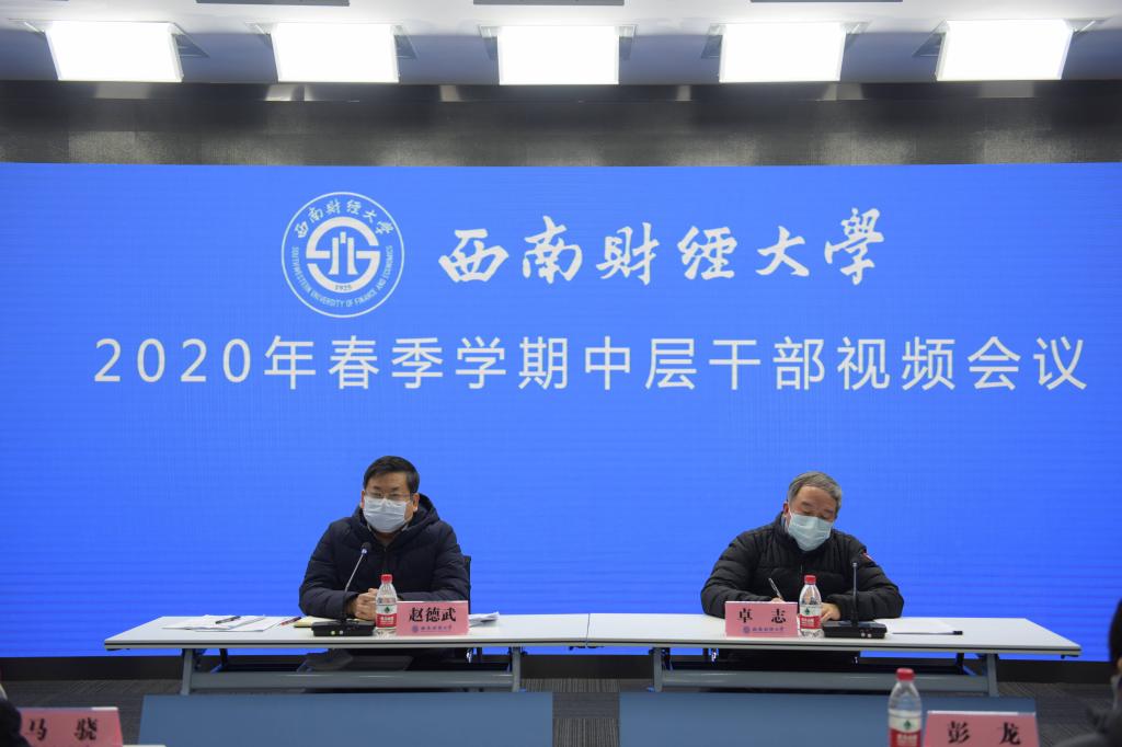 2月22日,学校召开2020年春季学期中层干部视频会议,安排部署今年学校工作和当前重点工作。党委书记赵德武,校长、党委副书记卓志,党委常委、常务副校长彭龙,党委副书记马骁、曾道荣,党委副书记、纪委书记范卫宏,党委常委、副校长欧兵、尹庆双、史代敏、张邦富、李永强以及党委委员在主会场参加会议,全体中层干部参加视频会议。赵德武主持会议。