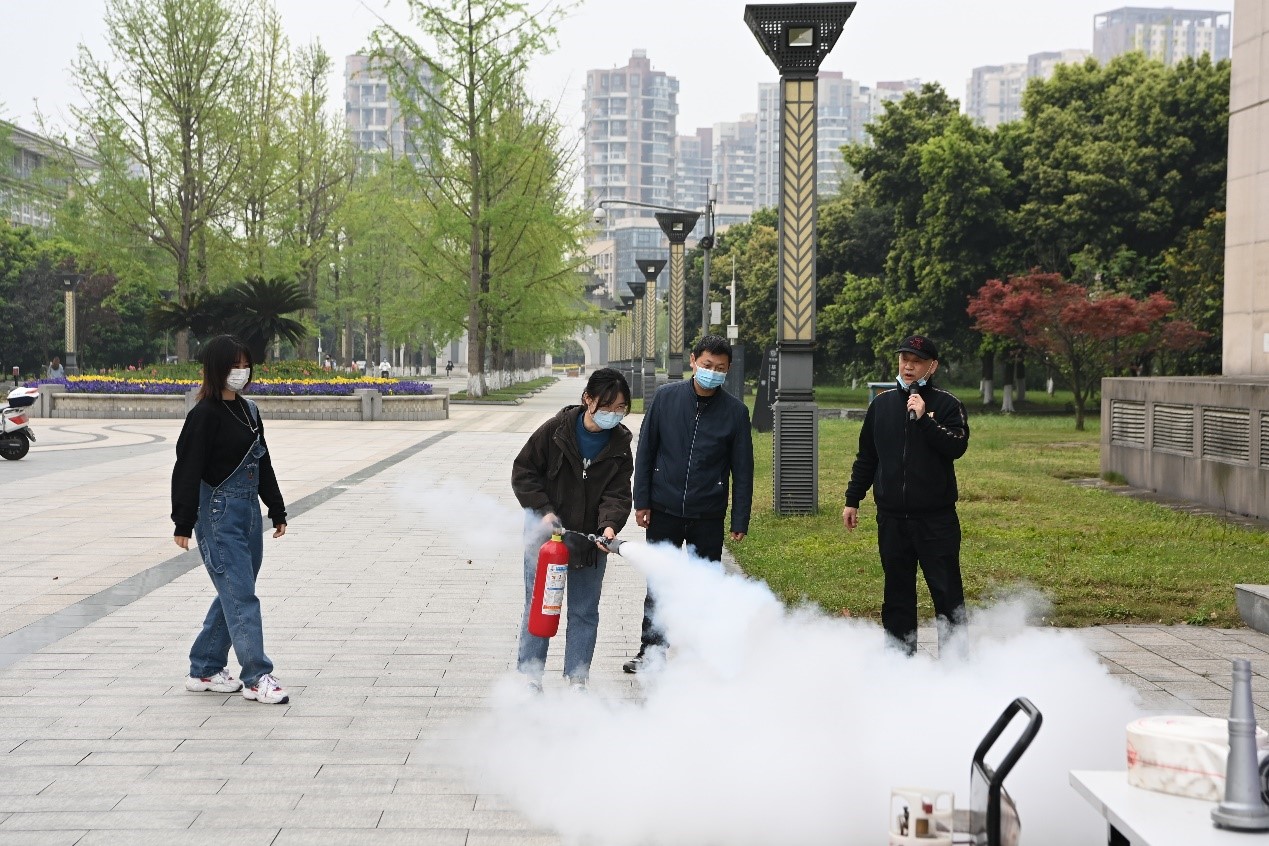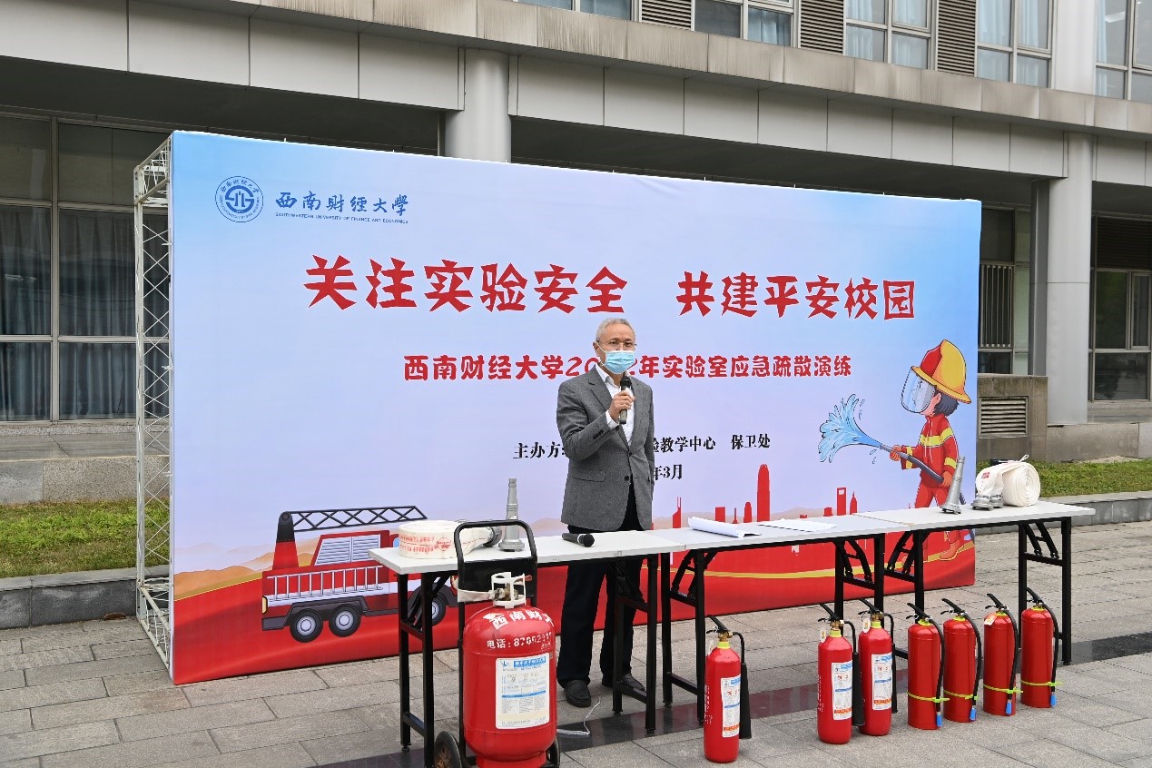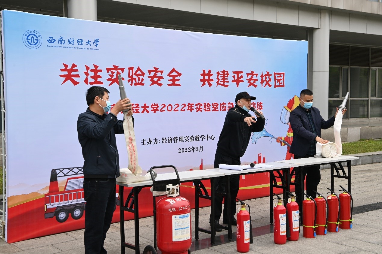 演练开始前,保卫处工作人员向师生介绍了本次应急疏散演练的目的意义和注意事项。经济管理实验教学中心主任王凯发出紧急疏散指令后,楼内实验室管理人员及任课教师立即引导学生按疏散路线有序撤离至楼外安全区域。随后,保卫处工作人员向在场师生示范讲解了不同灭火器和水枪水带的使用方法,并指导实验室安全管理人员和师生正确使用二氧化碳灭火器。