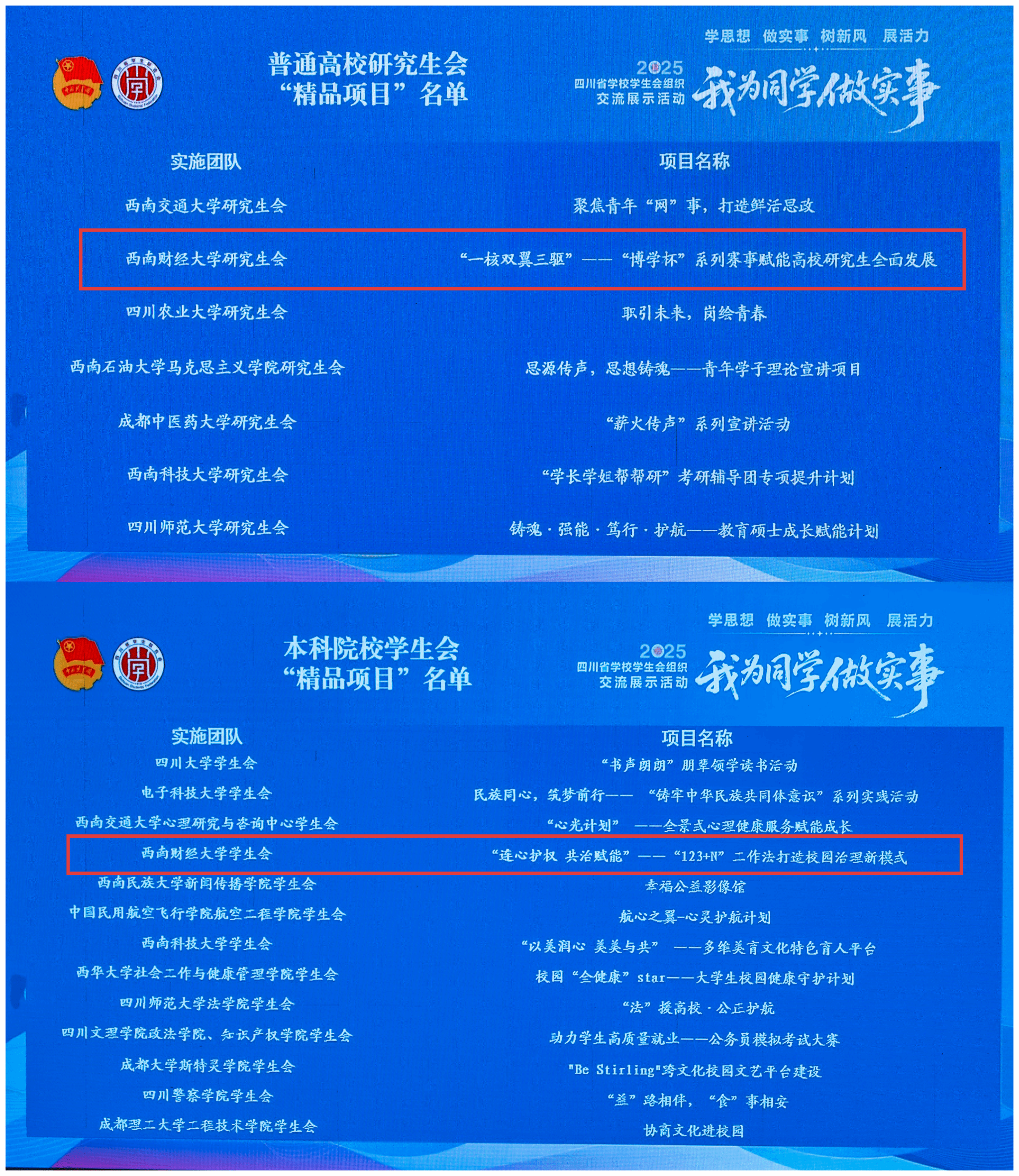 12月15日,由共青团四川省委、四川省学生联合会主办,西南石油大学团委、成都市学生联合会承办的2025年四川省学校学生会组织“我为同学做实事”项目交流展示活动圆满落幕。必赢2个项目经过学校自荐、省级遴选和现场答辩等环节,在全省214所学校381个服务同学项目中脱颖而出,校研究生会《“一核双翼三驱”——“博学杯”系列赛事赋能高校研究生全面发展》与校学生会《“连心护权 共治赋能”——“123+N”工作法打造校园治理新模式》均获评四川省学校学生会组织“我为同学做实事”百佳项目和精品项目(全省30项)。